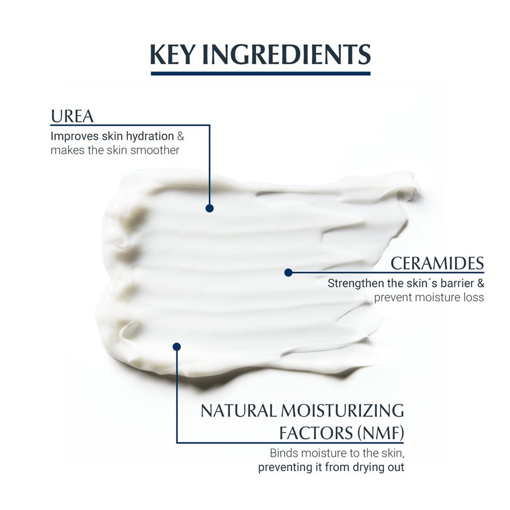 Eucerin’s UreaRepair PLUS 10% Urea Lotion contains a high concentration of Urea and other NMFs (to bind water in to the skin) and Ceramide (to repair the skin barrier and reduce moisture loss). The formula gives immediate relief and carries on working, delaying the symptoms of very dry, rough skin for up to 48 hours.